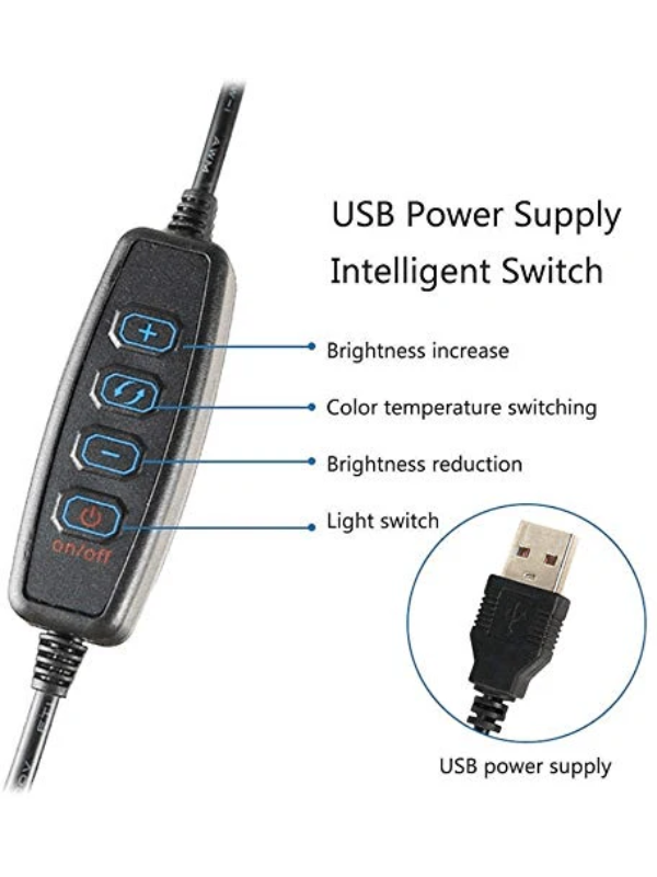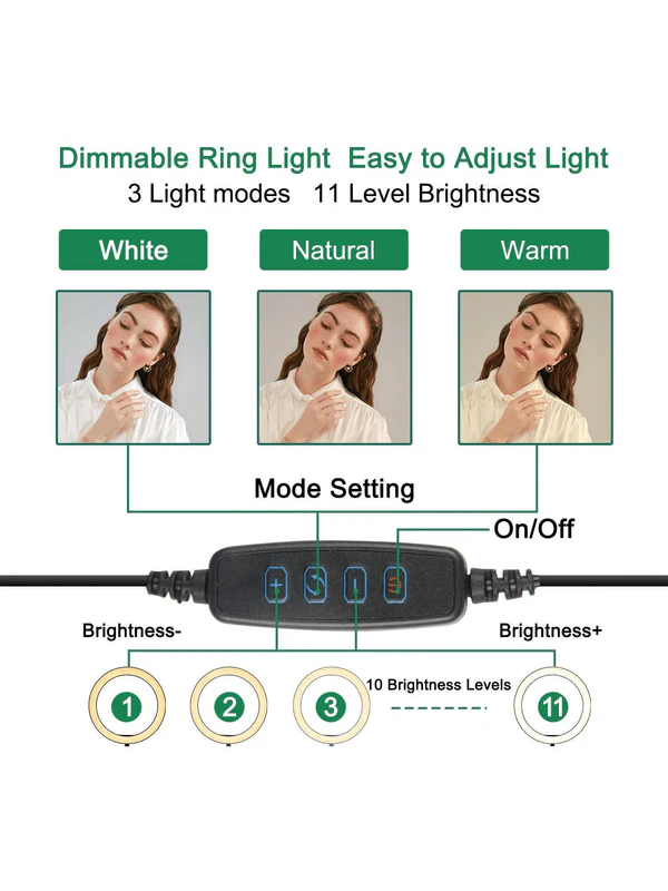 ضوء حلقة عاكس للضوء: - مصباح حلقي مقاس 10 بوصات يتميز بثلاثة ألوان فاتحة (دافئ، أبيض بارد، ضوء نهاري) و11 مستوى سطوع في كل لون، 33 خيارًا إجمالاً. يمكنك اختيار أي خيار بينهما إذا كان هناك إعداد مثالي.